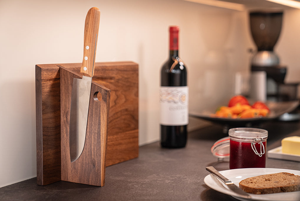 Two powerful neodymium magnets embedded in the wood hold your knife directly to the board. No more searching in a drawer, no more exposed blades on the work surface – everything is safely stored and ready for immediate use.
