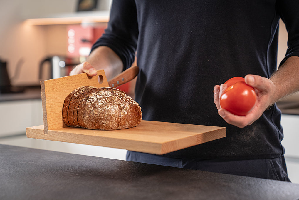 Soft items like fresh bread or ripe tomatoes tend to deform during cutting. The mill board solves precisely this problem: The vertical plate provides stability and prevents slippage. This makes soft items "firm" – and straight, clean slices are achieved effortlessly.