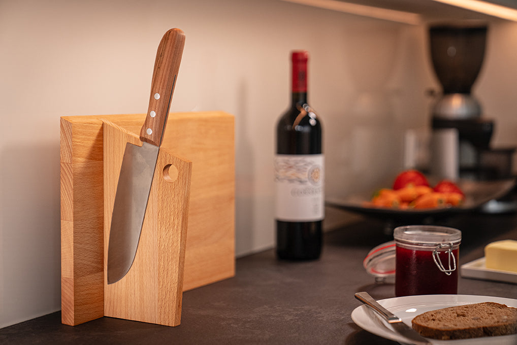 Dein Mühlenbrett geht es elegant aus dem Weg, wenn Du es nicht brauchst – stelle es einfach mit Messer am Schild dorthin, wo es Dir passt. Und habe beides in Sekunden griffbereit, wenn Du es brauchst. Kein Kramen, kein Suchen. Einfach kochen.